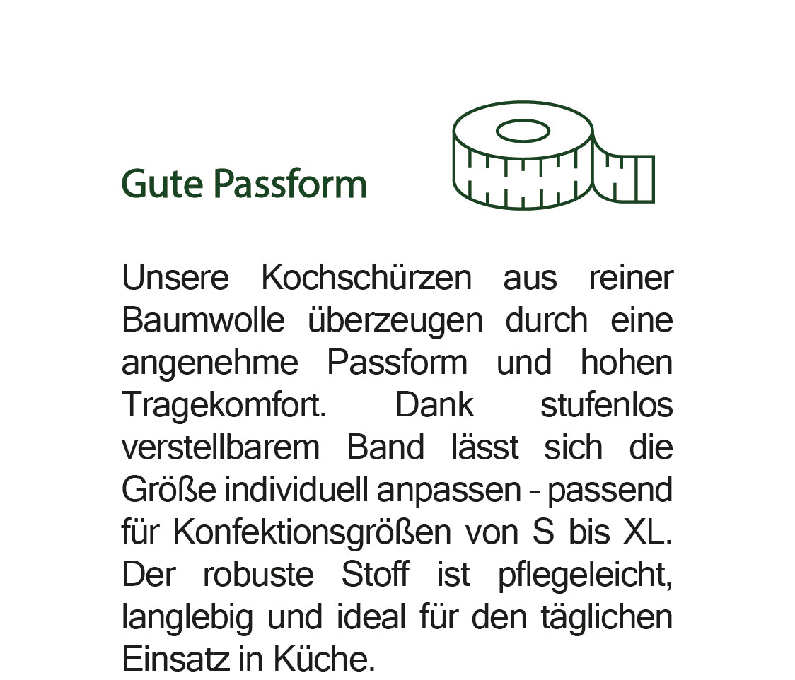 Unsere Schürzen aus hochwertiger Baumwolle lassen sich stufenlos verstellen und passen sich so flexibel jeder Körpergröße und -form an. Sie bieten zuverlässigen Schutz vor Flecken und heißen Flüssigkeiten – ideal für den Einsatz in der Hobby- wie in der Profiküche. Die klassischen Farben Weiß, Grau, Blau und Rot passen sich dezent Ihrer Kleidung an und machen die Schürze zum vielseitigen Begleiter im Küchenalltag.